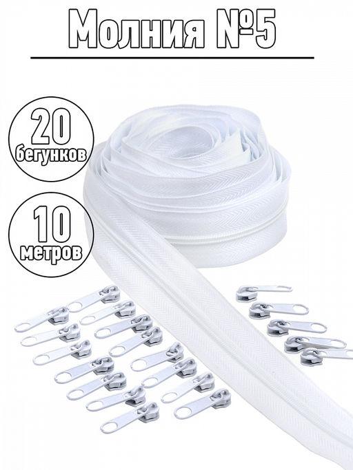 Набор молния Mzip рулонная 10м, бегунки 20шт для спирали №5 цв.F101 белый