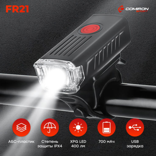 Фонарь передний COMIRON "FR21" корпус: ABS; свет: XPG LED, 400lm; аккумулятор 700 mAh, USB, влагозащищённый. /уп 125/500/