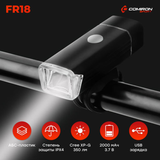 Фонарь передний COMIRON "FR18" корпус: алюминий +ABS свет CREE XPG LED 350m; аккум: 3.7V 2000 mAh USB влагозащищённый, индикация заряда /уп 60/120/