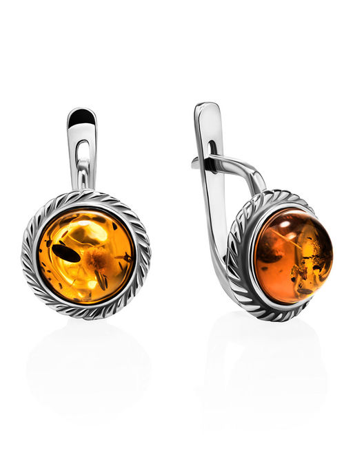 Небольшие круглые серьги Ампир из янтаря коньячного цвета