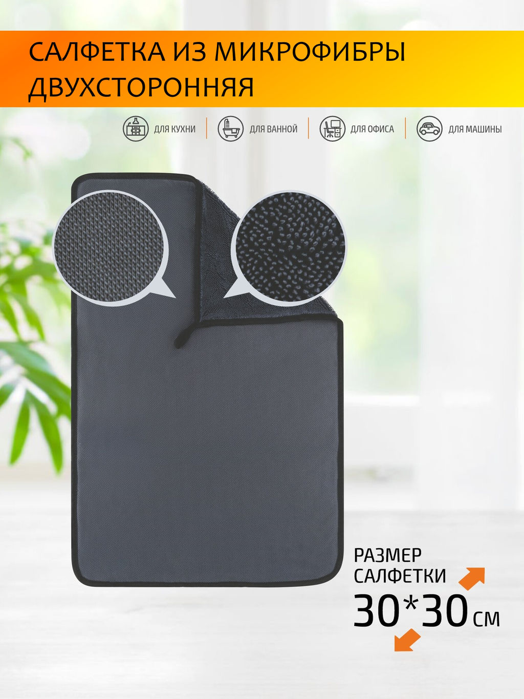 Салфетка из микрофибры двухсторонняя (гладкая+ворс) 30х30см, 500 гp/м2, темно-серый 109829 /MALLONY/