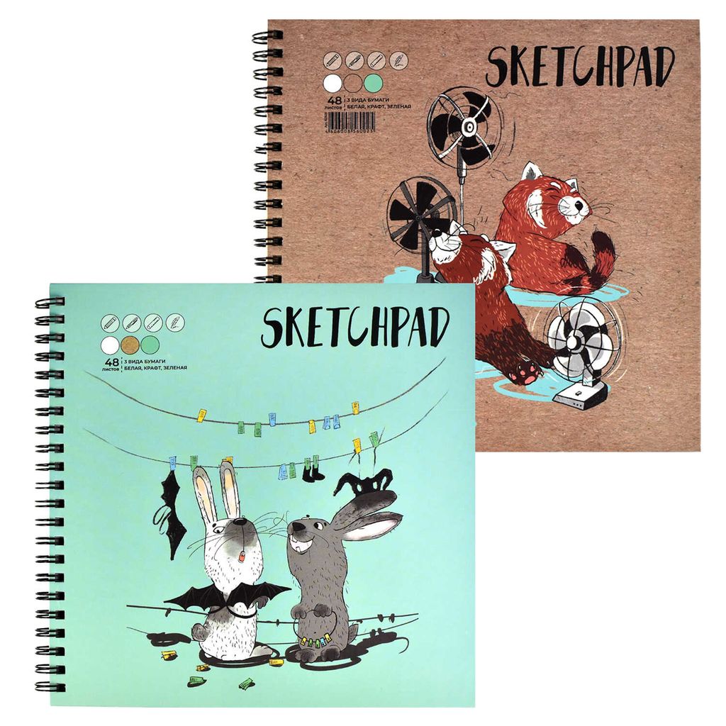 Скетчпад 195х195 мм, 48 л, блок - белый офсет, зелёный офсет, крафт-бумага 80 г/м?, арт. 62826 ЗАБАВНЫЕ ЖИВОТНЫЕ
