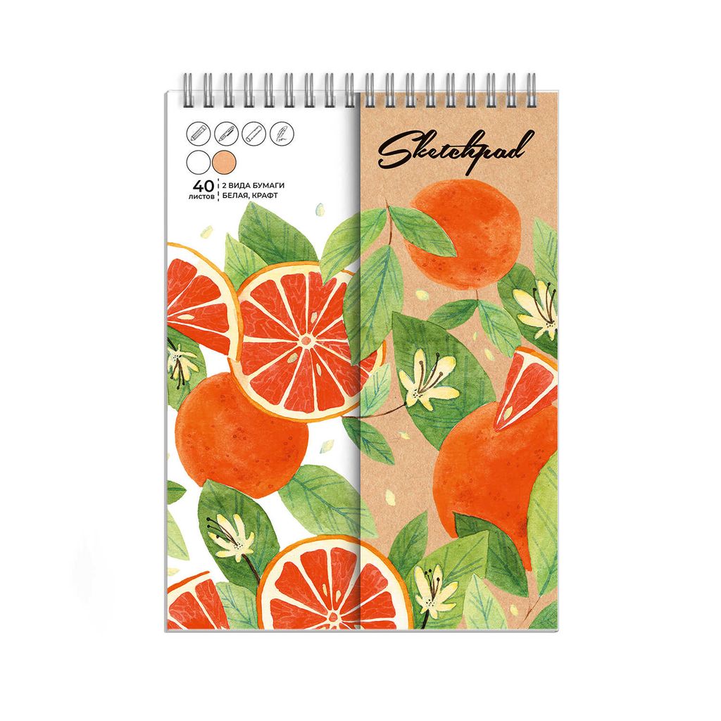 Скетчпад 125х150 мм, 40 л, блок - белый офсет, крафт-бумага 80 г/м?, арт. 62774 СОЧНЫЕ АПЕЛЬСИНЫ
