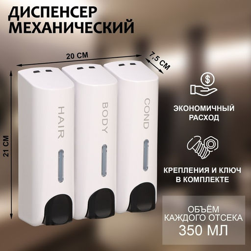 Диспенсер для мыла SAVANNA, механический, 3 отсека по 350 мл, шампунь, кондиционер, гель, белый