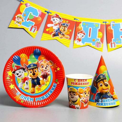 Посуда одноразовая бумажная для праздника С днем рождения!, на 6 персон, 19 предметов, Щенячий патруль