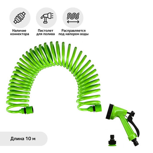 Шланг поливочный спиральный, 10 м, быстросъёмный, с поливочным пистолетом и штуцером, зелёный, Greengo