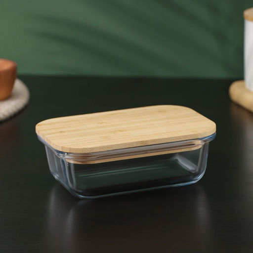 Контейнер для еды BellaTenero Эко, 370 мл, с бамбуковой крышкой, жаропрочное стекло, прозрачный
