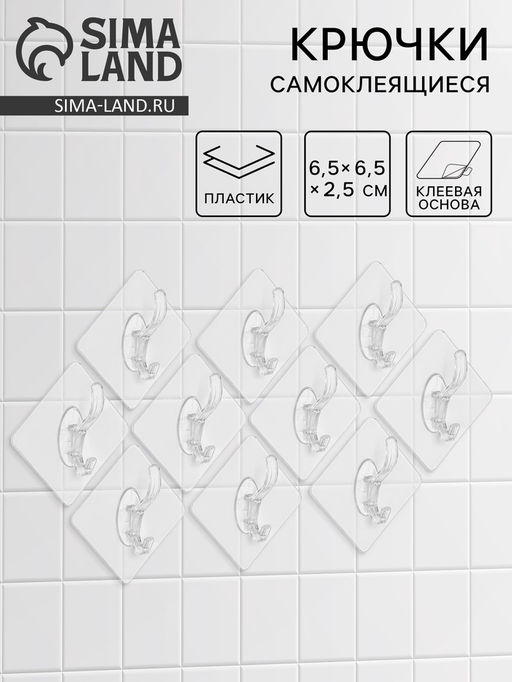 Крючки самоклеящиеся настенные прозрачные, с двойным крюком, 6.56.5 см, 10 шт.