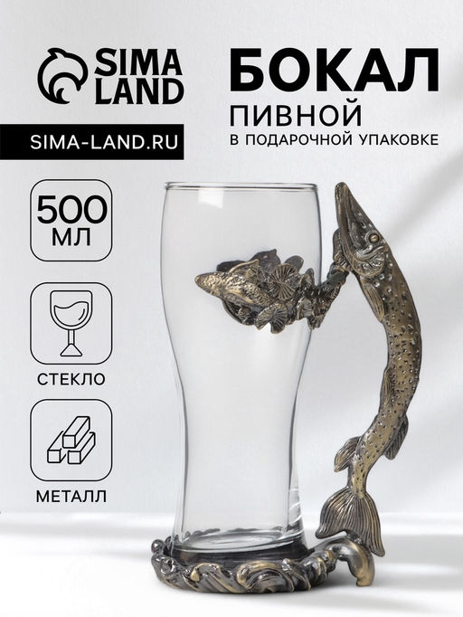 Пивной бокал 500 мл Щука, подарочный, стекло, металл