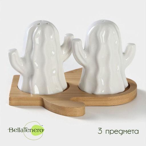 Набор для специй BellaTenero Кактусы, солонка 75 мл, перечница 75 мл, на бамбуковой подставке, фарфор, белый
