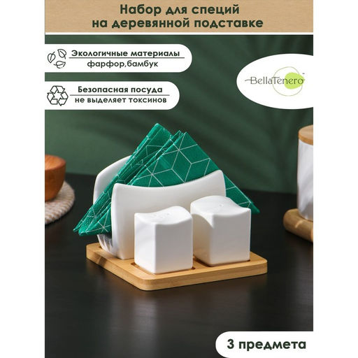 Набор для специй на бамбуковой подставке BellaTenero, 3 предмета: солонка 60 мл, перечница 50 мл, салфетница, фарфор, белый