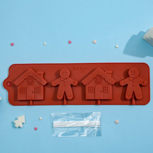 Форма для леденцов новогодняя Доляна Дом для имбирного пряника, силикон, 31?9?1 см, 4 ячейки, с палочками, красная
