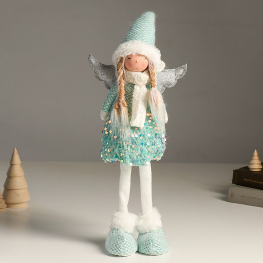 Интерьерная кукла текстильная Ангелочек в бирюзовом наряде с пайетками, серебристые крылья, 49 см