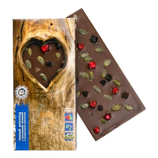 Шоколад темный с брусникой, черникой и тыквенными семечками коробка 90 г