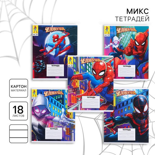 Цена за 20 шт. Тетрадь 18 листов, в линейку, МИКС 5 видов, обложка мелованный картон, Человек-паук