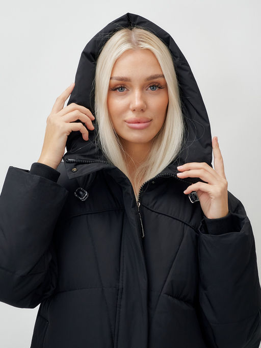 Пальто летучая мышь женское с капюшоном зимнее черного цвета 9616Ch