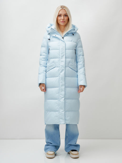 Пальто утепленное стеганное зимнее с капюшоном женское голубого цвета 9610Gl