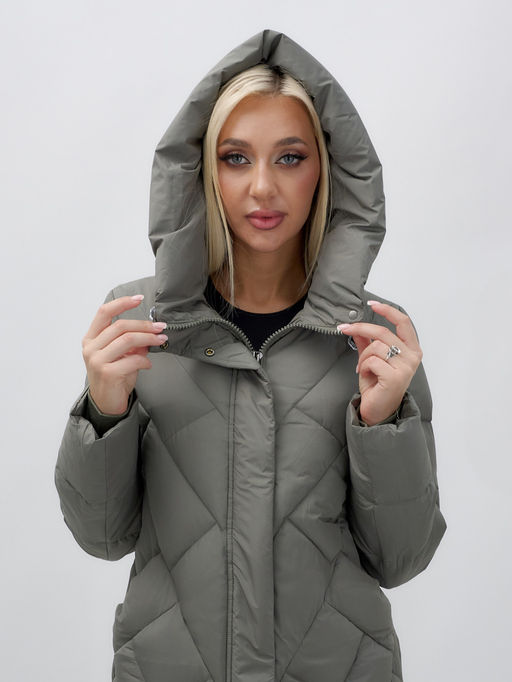 Пальто утепленное стеганное зимнее с капюшоном женское цвета хаки 9612Kh