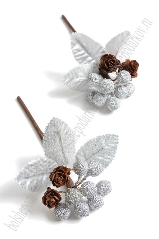 Веточка декоративных ягод с шишками 12 см (12 шт) SF-2332, серебро