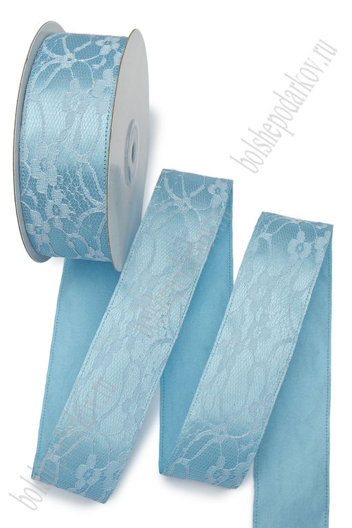 Лента атласная 4 см*25 ярд с кружевом (SF-7217) голубой №187
