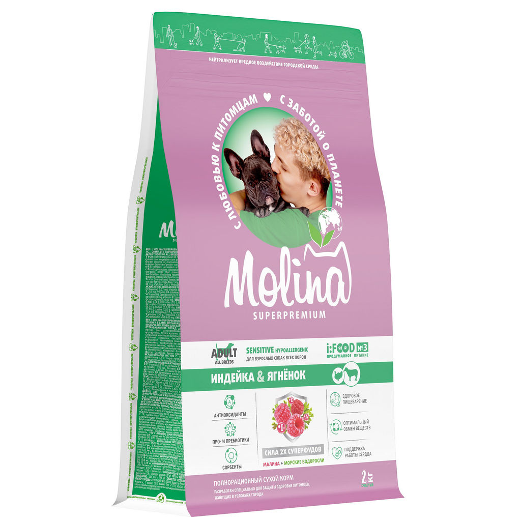 MOLINA, Сухой корм с инд и ягненком для взр.собак всех пород с чувствит.пищеварением, 2кг, 1060895