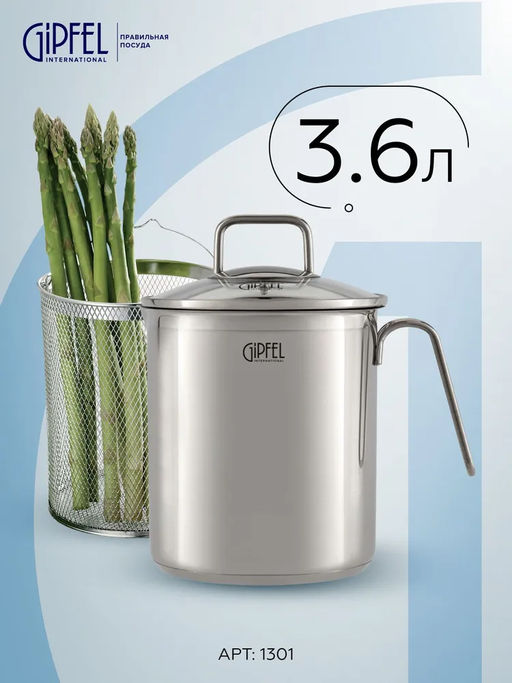 1301 GIPFEL Кастрюля ITUM 16х18см/3,6 л для варки овощей, со съемным ситом, стеклянная крышка с уплотнением Материал: нержавеющая сталь 18/8, капсульной дно. Толщина: 0,6 мм / 3мм