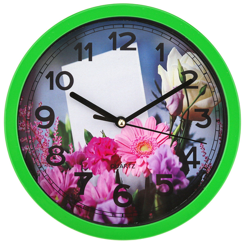 Часы настенные "Букет" д19,5х4см, мягкий ход, циферблат фотопечать, пластм. зеленый, в коробке (Китай)