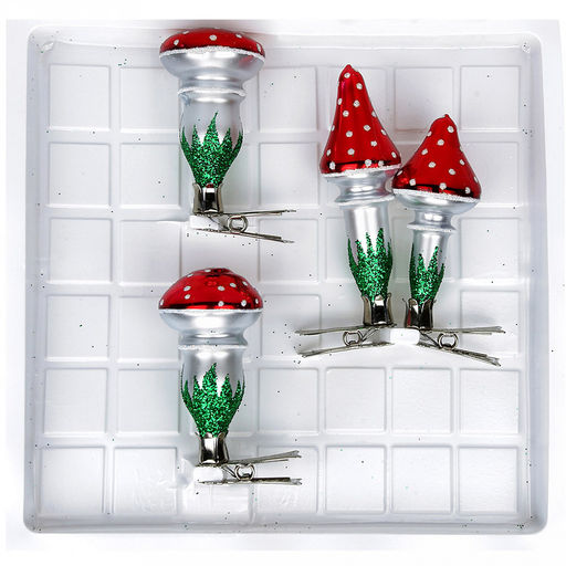 Елочная игрушка фигурка стеклянная "Мухоморы", на прищепке, ручная художественная роспись, подарочная упаковка, набор 4шт (Россия)