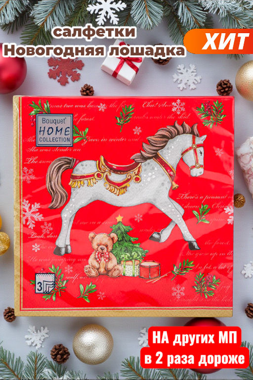 Салфетки бумажные "Bouquet Home Collection Classic" 33х33см, 3-х слойные, 20 штук в упаковке, 100% целлюлоза, "Новогодняя лошадка. Красный фон" (Россия)