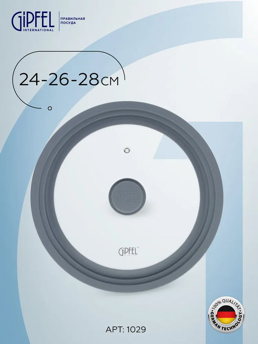 1029 GIPFEL Крышка GIUM стеклянная на 3 размера 24,26,28 см с силиконовым ободом Цвет: темно-серый. Материал: закаленное стекло, силикон, нерж. сталь 18/8