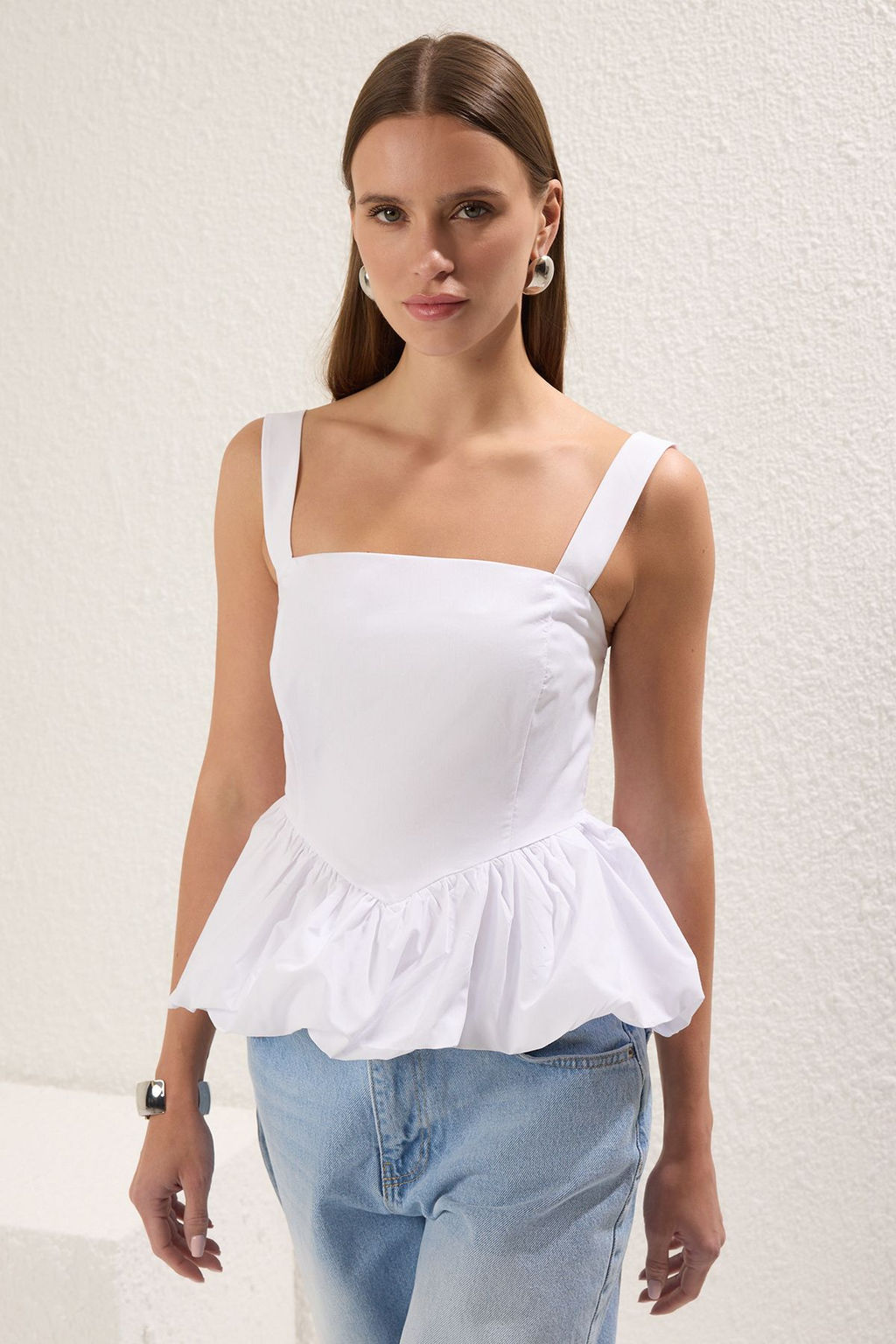 Trendyolmilla Ac?k Mavi Balon Etek Ask?l? Dokuma Dokuma Bluz TWOSS25BZ00354