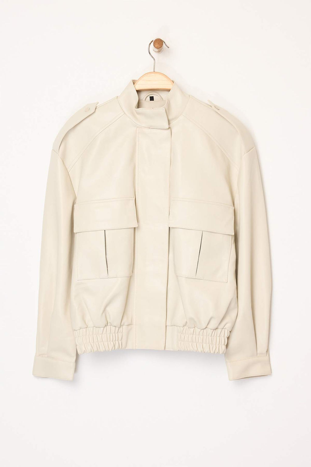 Ekru Oversize Kal?p Suni Deri Bomber Ince Ceket Mont TWOAW26MO00001