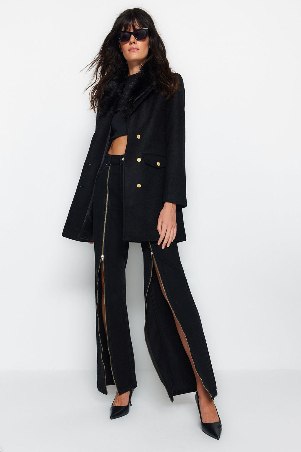 Trendyolmilla Siyah Premium Kurk Yaka Detayl? Gold Dugmeli Kase Kaban TWOAW24KB00100