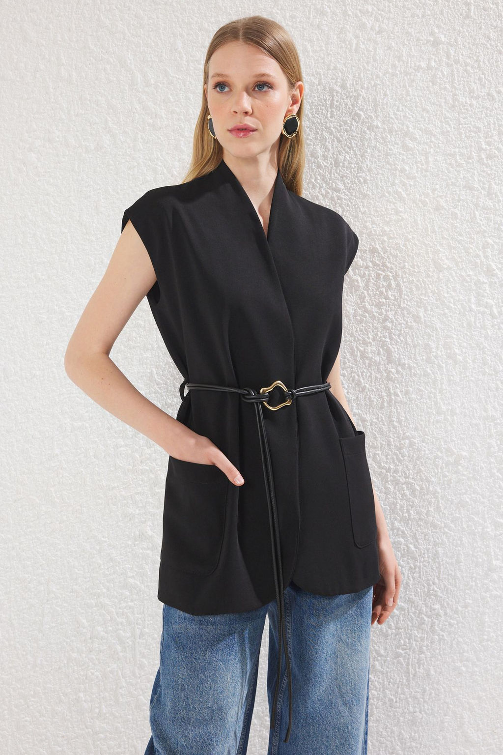 TRENDYOLMILLA Siyah Regular Kemer Detayl? Cepli V Yaka Dokuma Yelek TWOSS25YE00053