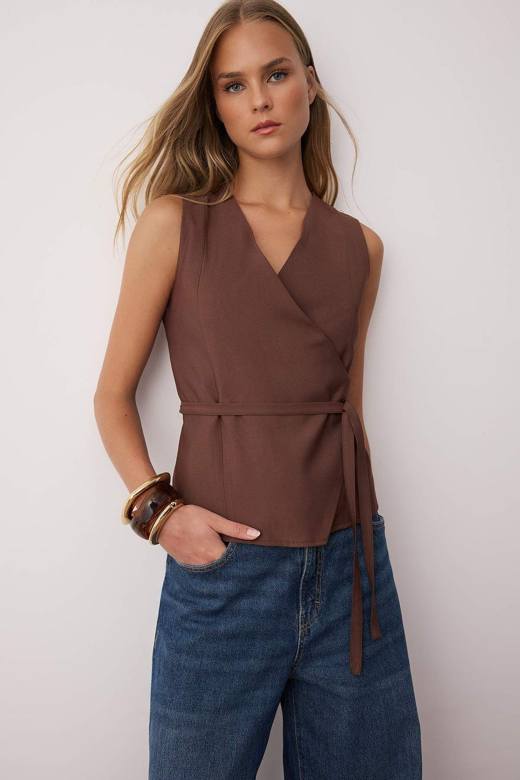 Kahverengi Kusakl? Baglama Detayl? Kruvaze Kapamal? Yumusak Tuseli Dokuma Yelek TWOAW26YE00018