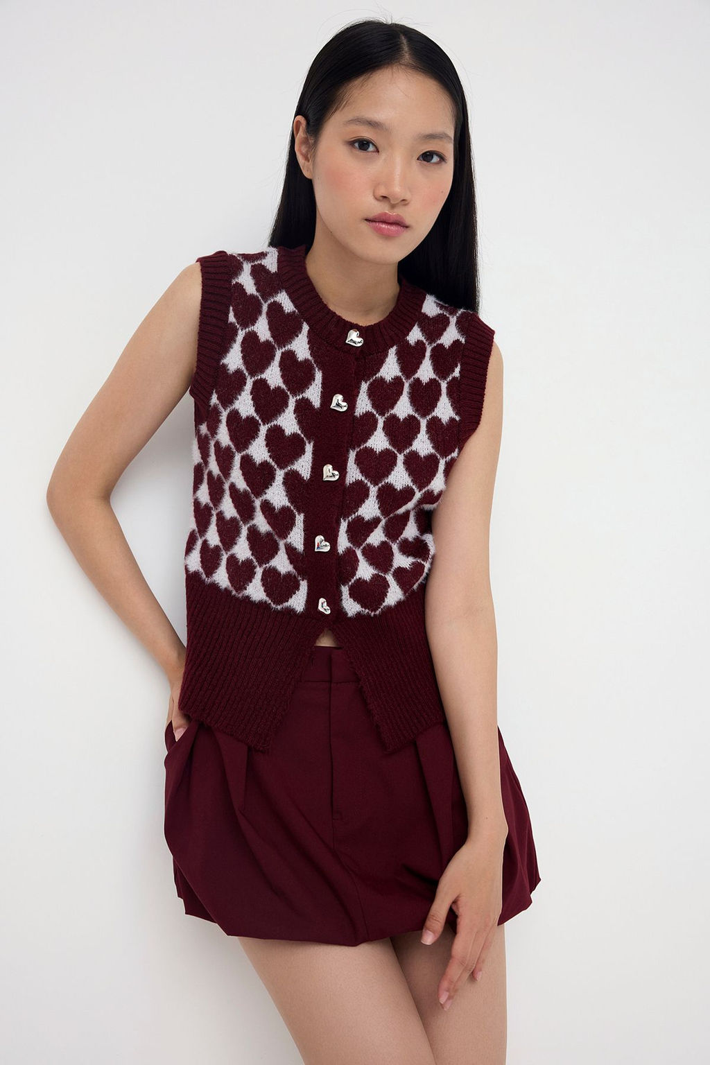 Teen Bordo Sakal/Yumos Iplik Kar?s?ml? Kalp Desenli Triko Yelek TWOAW26YE00012