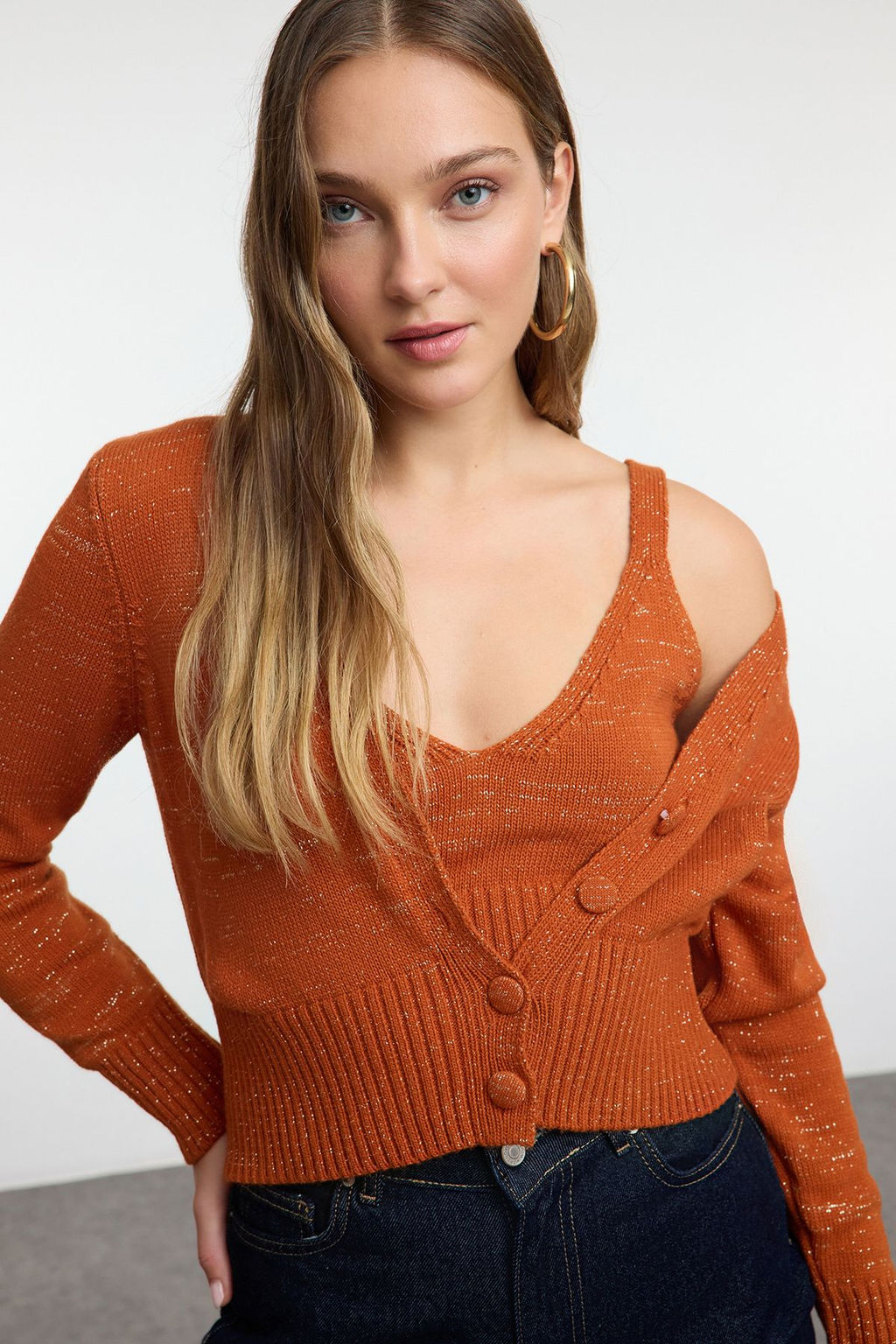 TRENDYOLMILLA Kiremit Crop Bluz-H?rka Tak?m Triko H?rka TWOAW25HI00199