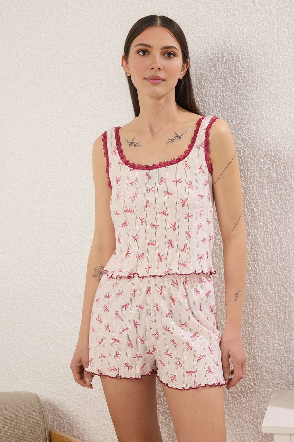 Trendyolmilla Ekru Cicekli Dantelli Pointel Ajurlu/Delikli Sortlu Orme Pijama Tak?m? THMSS25PT00079