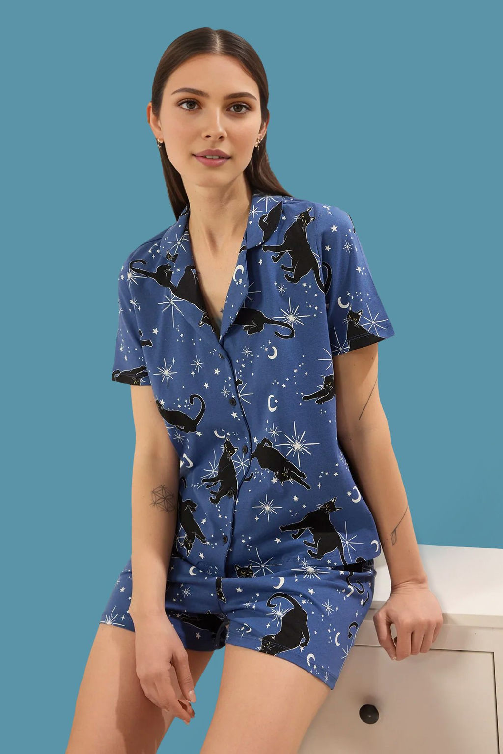 Trendyolmilla Lacivert %100 Pamuklu Kedi ve Galaksi Desenli Sortlu Orme Pijama Tak?m? THMSS25PT00370