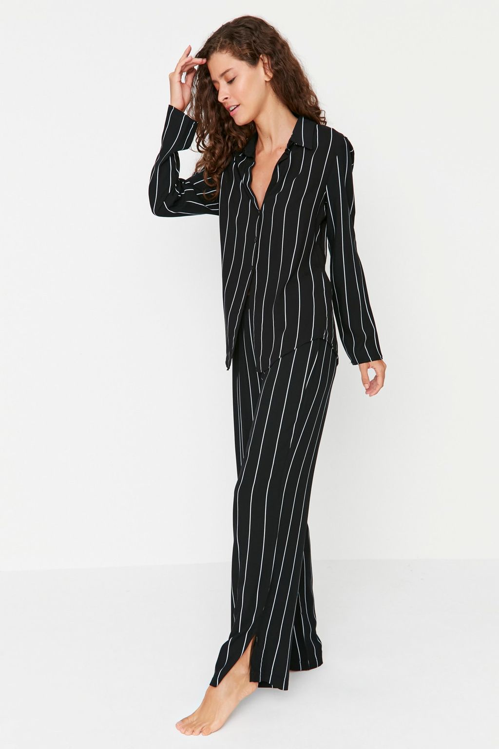 Trendyolmilla Siyah Cizgili Y?rtmac Detayl? Viskon Gomlek-Pantolon Dokuma Pijama Tak?m? THMAW23PT00158