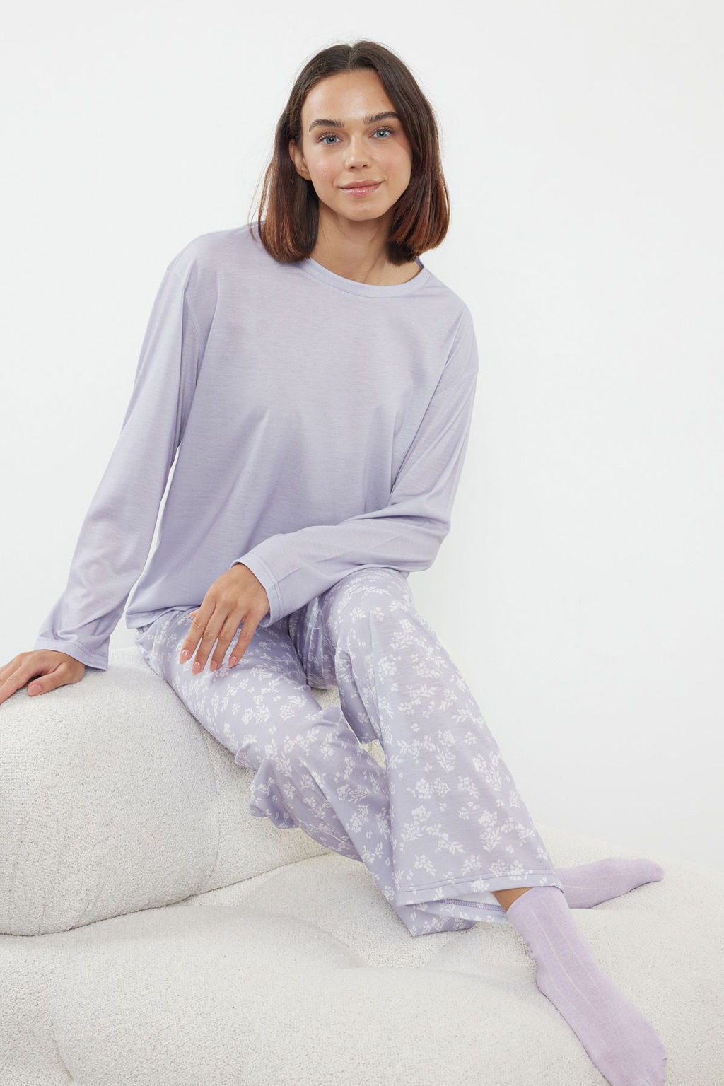 Trendyolmilla Lila %100 Pamuklu Cicekli Orme Pijama Tak?m? THMAW25PT00187