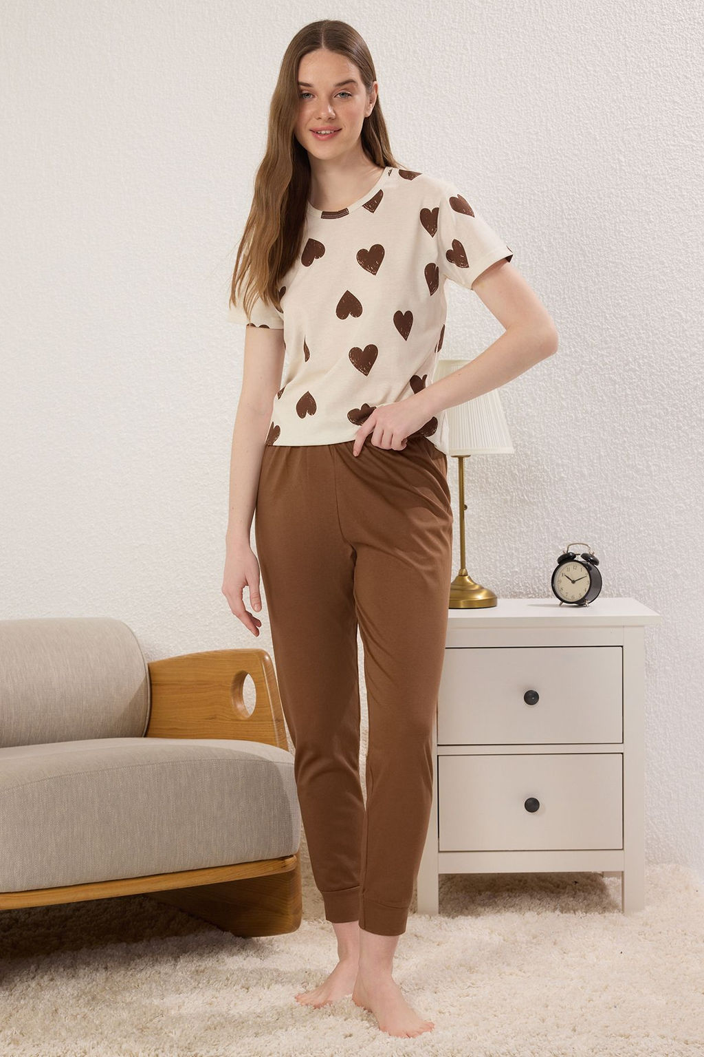 Trendyolmilla Kahverengi-Cok Renkli Pamuklu Kalpli Orme Pijama Tak?m? THMSS25PT00383