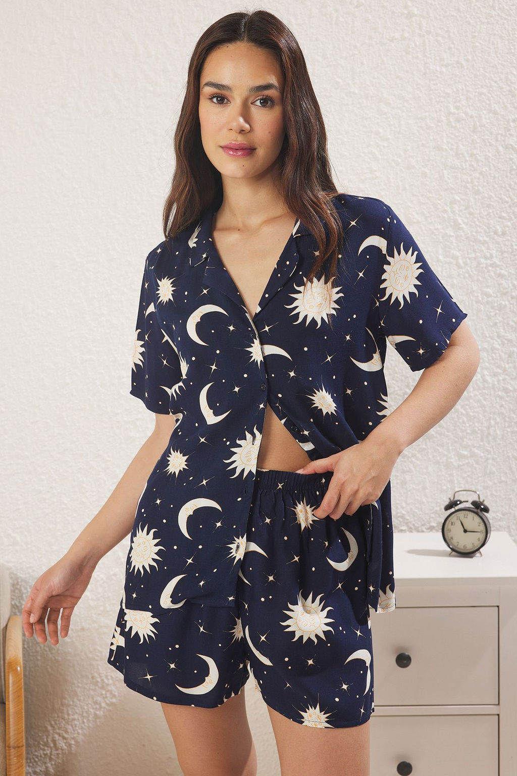 Trendyolmilla Lacivert Galaksi Desenli Viskon Sortlu Dokuma Pijama Tak?m? THMSS25PT00411