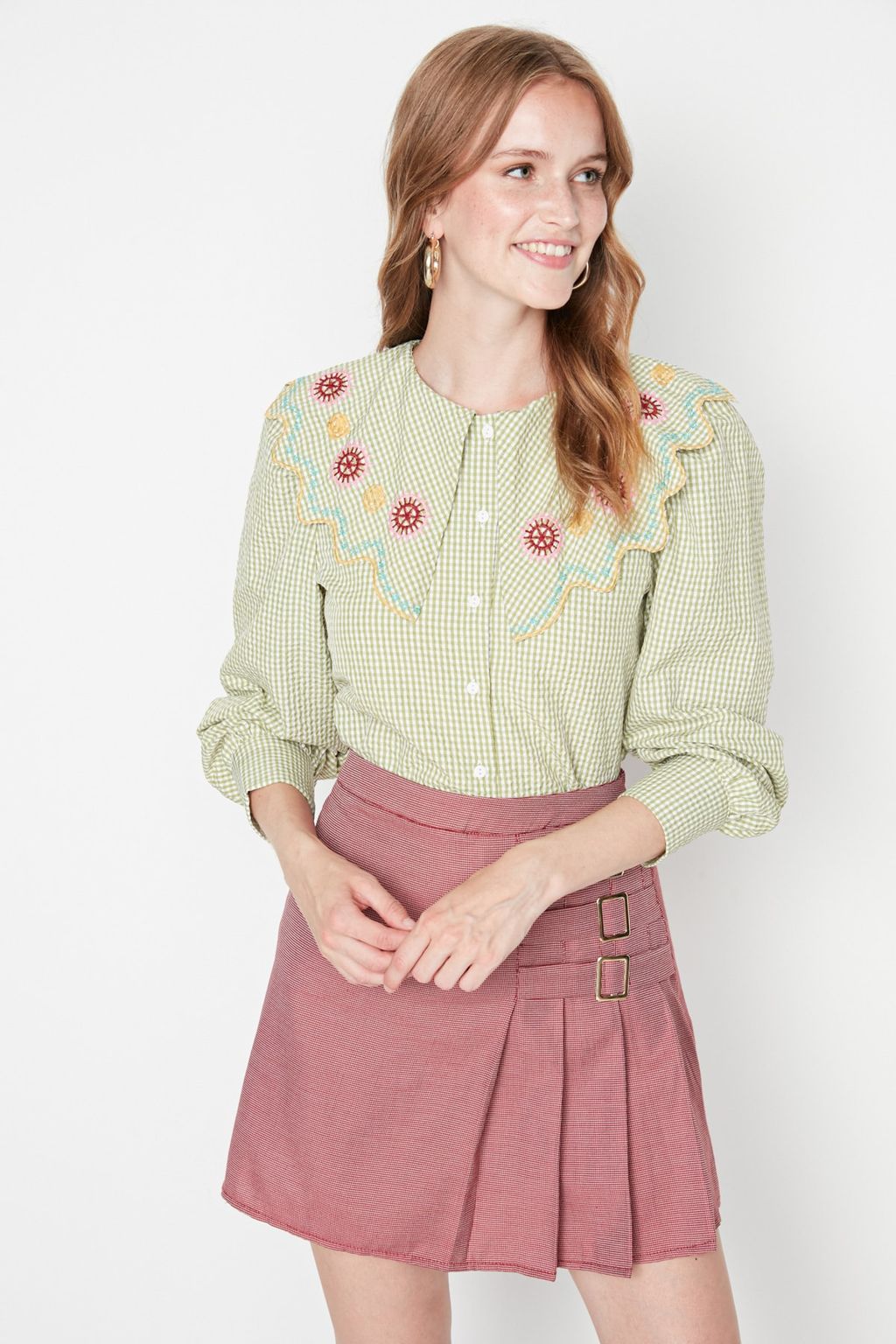 TRENDYOLMILLA Yesil Nak?s Detayl? Gofre Kumas Regular Normal Kal?p Dokuma Gomlek TWOSS21GO0232