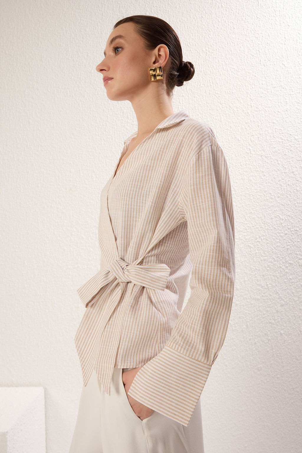 TRENDYOLMILLA Bej Yandan Baglama Detayl? Flaml? Pamuklu Regular Normal Kal?p Dokuma Gomlek TWOSS25GO00108