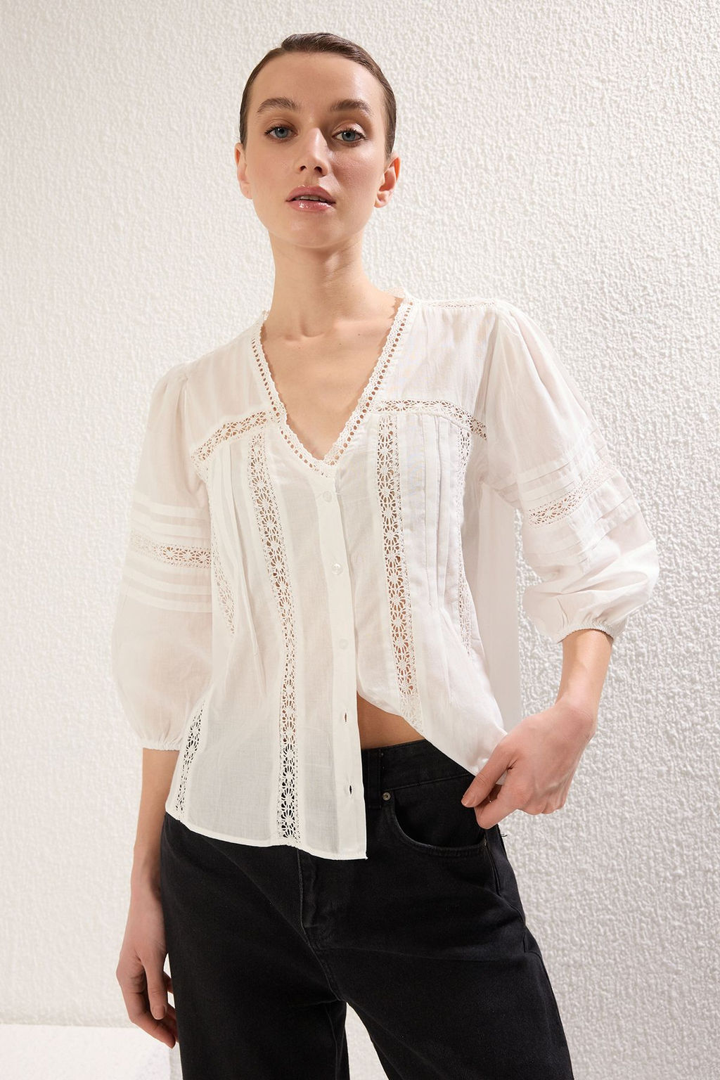 TRENDYOLMILLA Beyaz Pamuklu Kumas Dantel Detayl? Regular Normal Kal?p Dokuma Gomlek TWOSS25GO00030