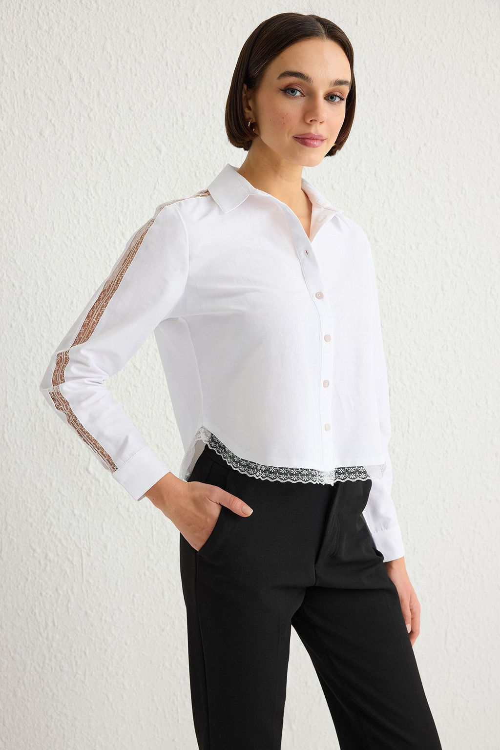 TRENDYOLMILLA Beyaz Kol ve Omuzlarda Dantel Detayl? Regular Normal Kal?p Dokuma Gomlek TWOSS25GO00049