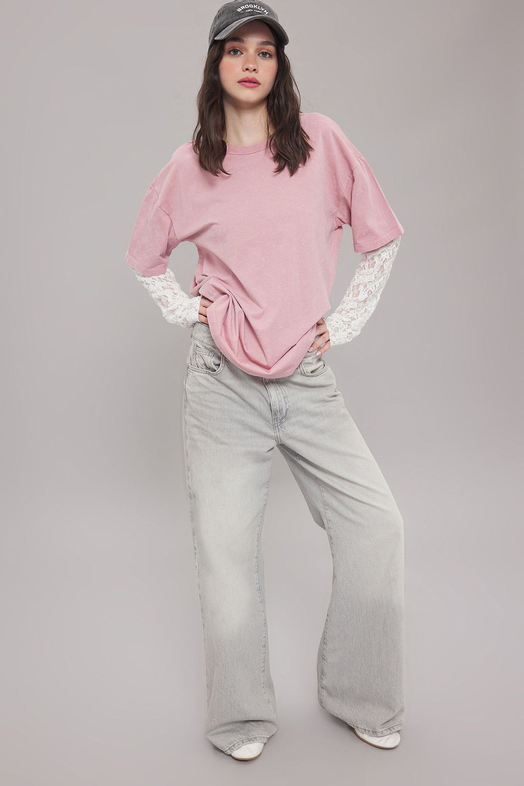 TRENDYOLMILLA Pembe Y?kamal? Dantel Detayl? Oversize/Genis Kal?p Orme T-Shirt TWOAW25TS00022