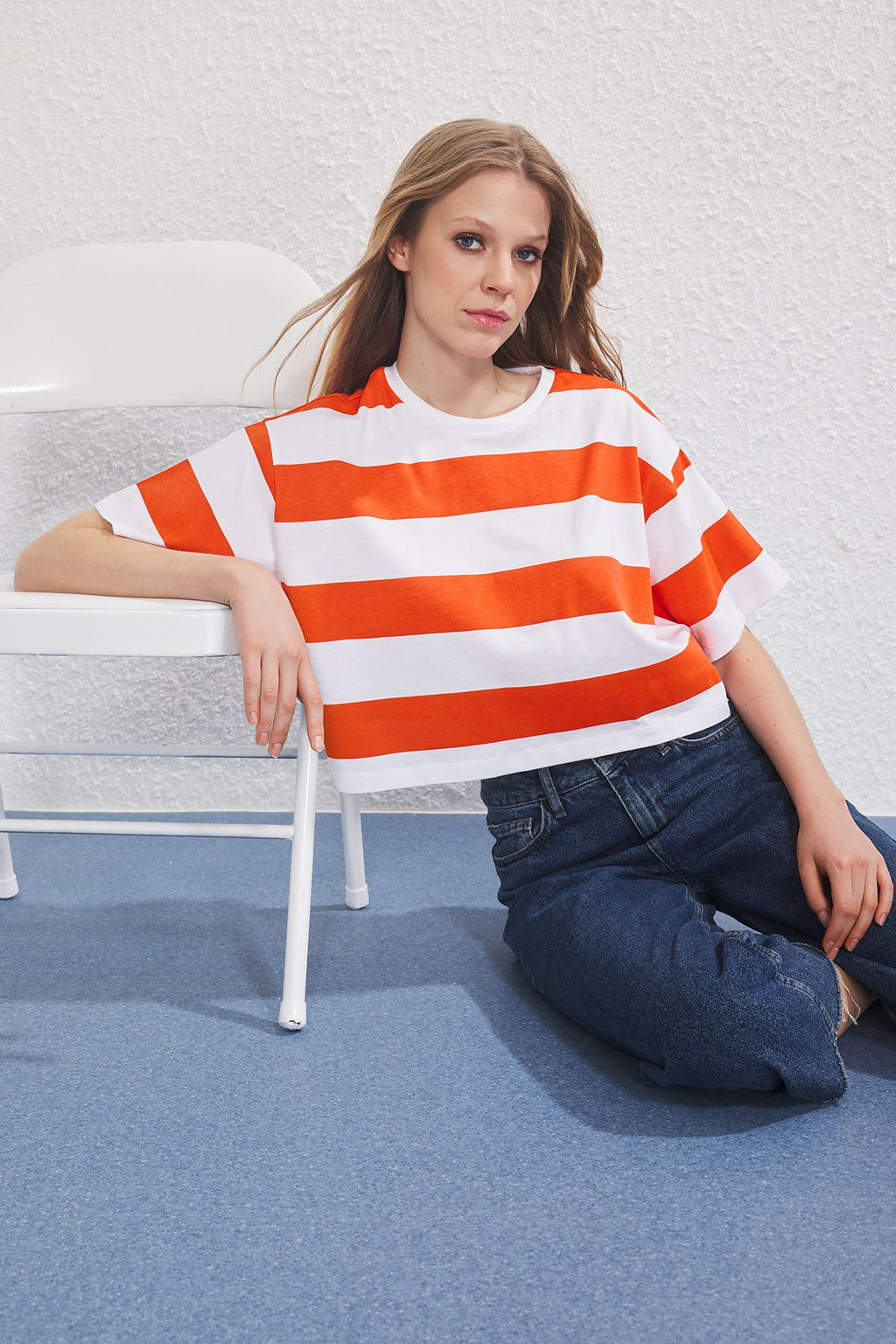 TRENDYOLMILLA Kahverengi Cizgili Bisiklet Yaka Loose Crop/Rahat K?sa Orme T-Shirt TWOSS25TS00193