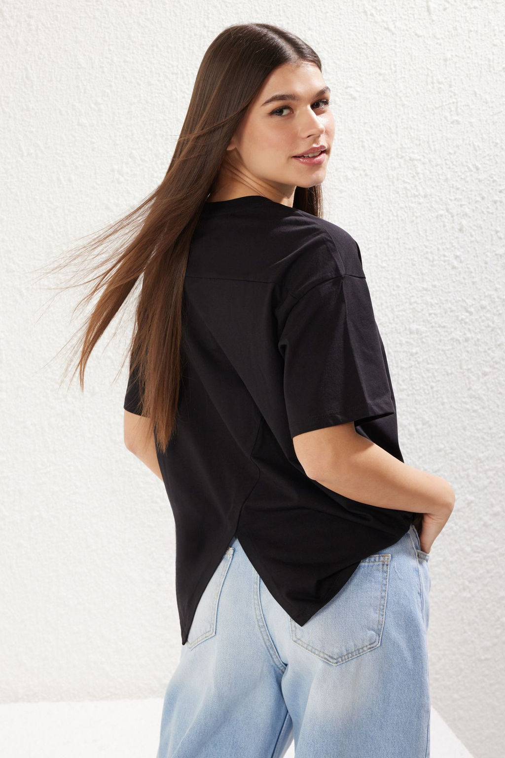 TRENDYOLMILLA Visne Curugu %100 Suprem Oversize/Genis Kesim Asimetrik S?rt Detayl? Orme T-Shirt TWOSS25TS00040